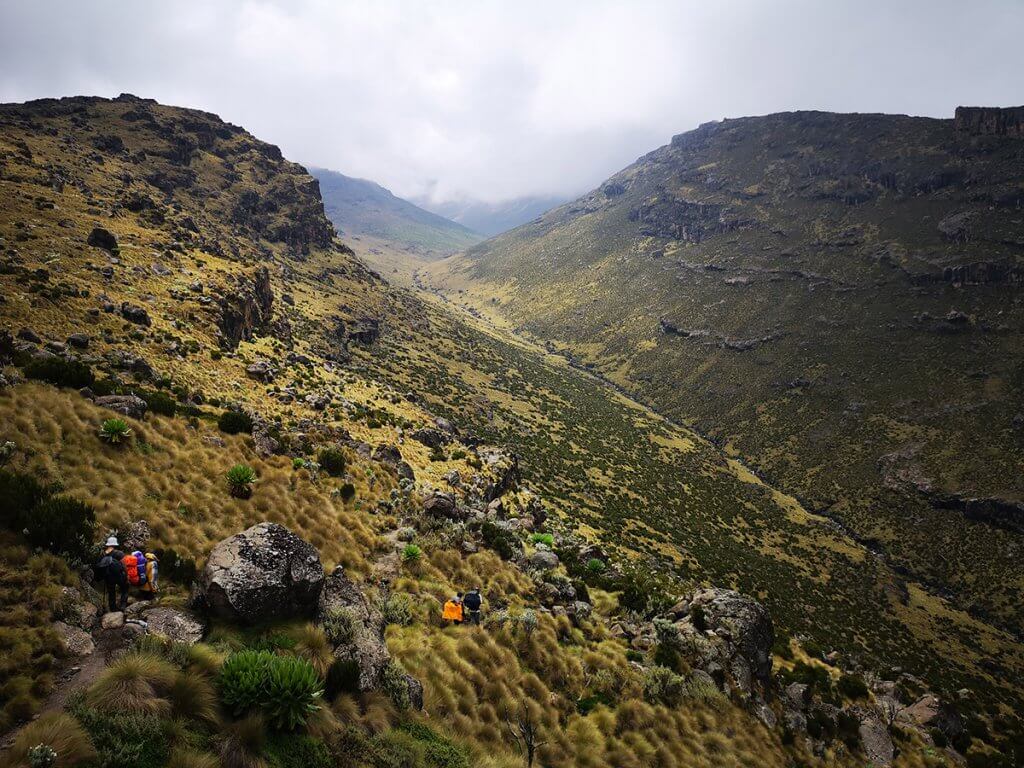 Uns umgeben jetzt nur die absurden Lobelias, Felsen und gelbes Gras. Die Höhe macht sich bemerkbar, und einige der Touris, die es früh morgens eilig hatten, gehen jetzt nur noch sehr langsam vorwärts.